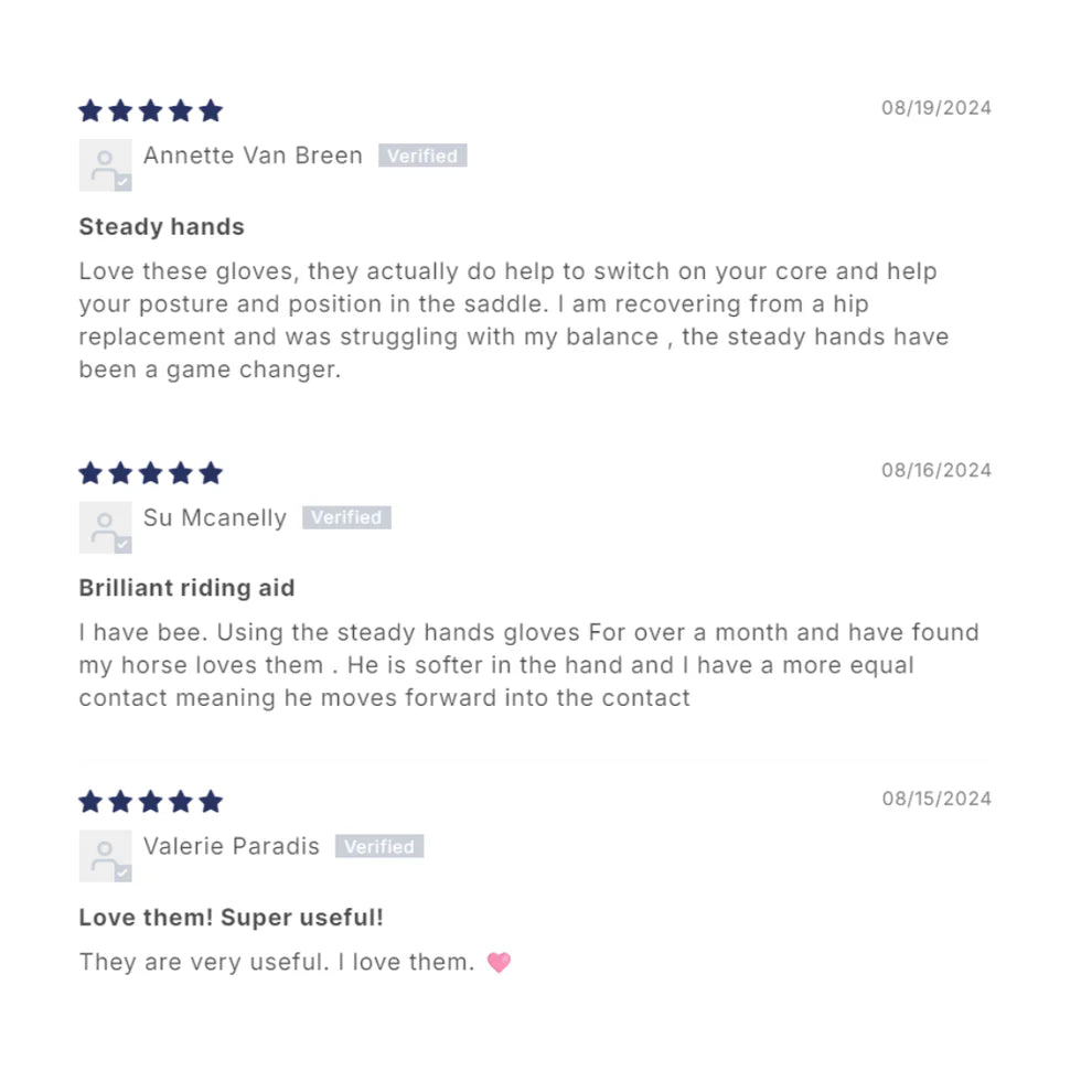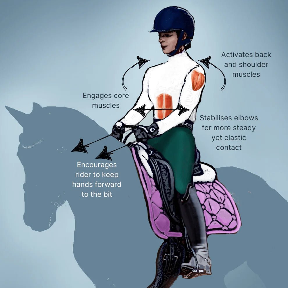„Ich dachte, ich hätte gute Hände, bis mir das hier dabei half, eine hinterhältige rechte Hand zu erwischen, die außer Kontrolle geriet, und zwar mit sofortigem Biofeedback, das sogar bei ausgeschaltetem Gerät anhielt.“ – Steph, Dressurreiterin